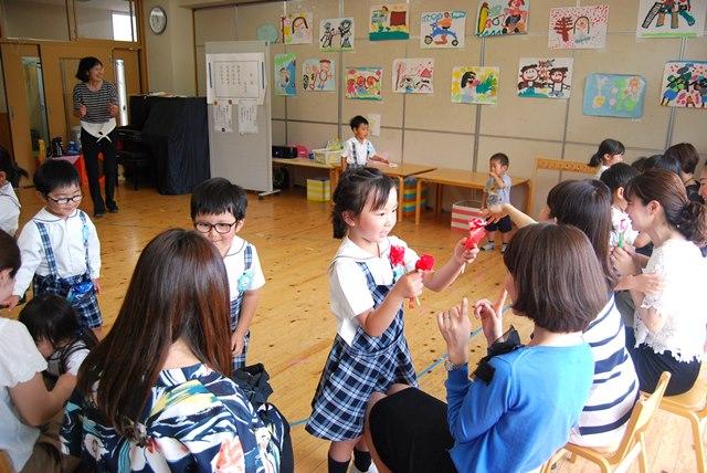 年少さんや年長さんもお母さんたちとふれあい遊びをした後、感謝の気持ちを込めて一生懸命作った手作りのメモホルダーやキーホルダーのプレゼントを手渡しました。お母さんたちも嬉しそうに受け取り子どもたちをぎゅっと抱きしめました。