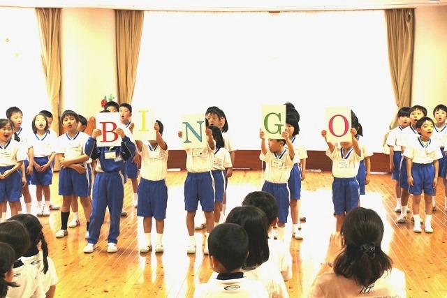 それに応えてP2の児童たちからお返しの言葉と、アルファベットのパネルも使った楽しいパフォーマンスも入れて「BINGO」の歌を園児にプレゼントしました。