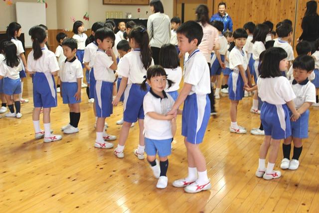 続いてP2の児童とPP2の園児がペアになって、ふれあい遊び「ひっつきもっつき」で、盛り上がりました。「もっとしっかり手を持ってね」「おもしろいね」と、P2児童たちは、照れながらもすっかりお兄さんお姉さんぶりを発揮していました。