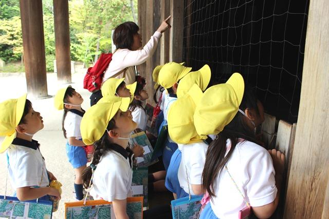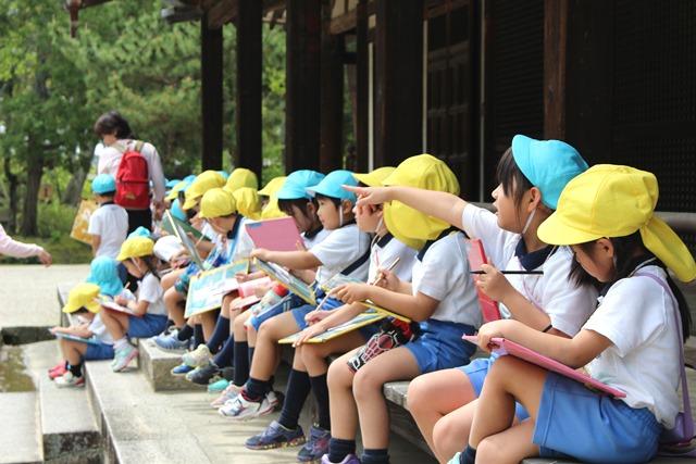あっと言う間の遠足も終盤となった頃「鑑真さんが見たい」という子どもがいました。そこで国宝鑑真和上坐像を収めた御影堂に行き、みんなでそのお姿を拝観しました。ガラス越しの坐像に、みんなは「来ましたよ」「帰りますけどまた来ますよ」「さようなら」と、大きな声をかけて、帰路につきました。