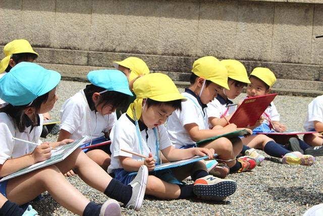 合計3箇所の建物の絵をスケッチしていく中で、屋根の様子や、柱の形など、どんどん正確に描くことが出来るようになっていきます。屋根の瓦を一枚ずつ丁寧に書いている子どもに「絵の先生みたいだね」と声をかけると、自信たっぷりの表情で「すごいでしょ」と描いた絵を立てて見せてくれました。