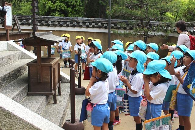 4月25日(火)、初夏を思わせるほどの好天に恵まれた中、年長組の園児たちは、バスに乗って唐招提寺(奈良市)へ春の遠足に出かけました。