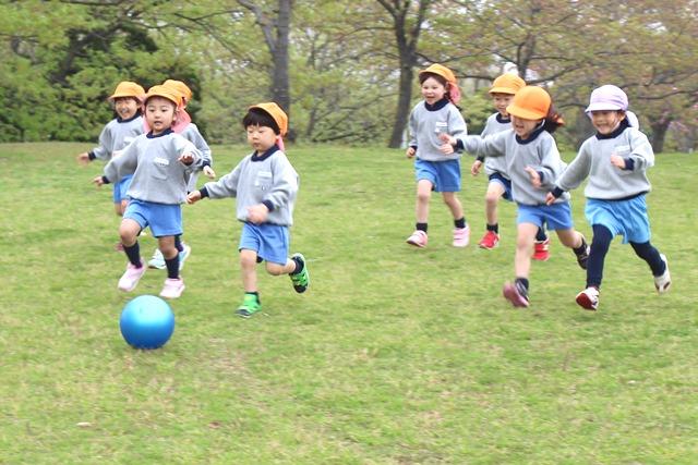 芝生の広場では、坂を転がるボールやフープを、全速力で追いかけました。