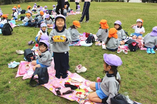 元気に体を動かした子どもたちから「先生、お腹すいた」という声が。待ちに待ったお弁当タイムです。芝生の上に各々がシートを敷き、「いただきます」の声と共にお弁当を食べました。お友だちと見せ合って「これお母さんが作ったんだよ」「見て、見て、わたしのイチゴはこんなに大きいよ」「卵焼きはお姉ちゃんが作れるんだ」と、賑やかなお昼です。