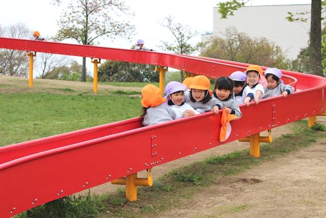 長いローラー滑り台では、ころころとお尻の下で回るローラーを感じながらみんなで連なって滑って遊びました。ジャングルジムやその他のアスレチック遊具でも、子どもたちの歓声が、広場に響いていました。