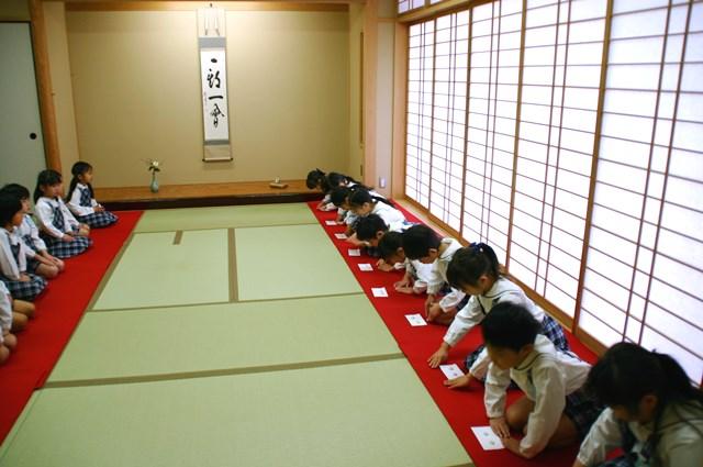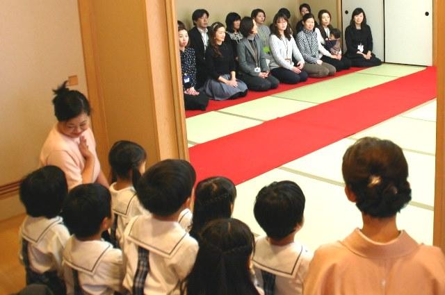 年長の子どもたちは毎月1回、裏千家の赤木宗好先生より作法室で礼法のお稽古に取り組んできました。3月6日(月)に行われた最後のお稽古では、保護者の方をお招きして、日頃練習している成果を見ていただく礼法参観を開催しました。