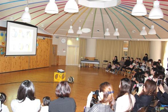 スライドが終わり、先生たちと一緒にいつも歌っていた「おはよう」「あたまかたひざポン」「ぐるぐるぐるぐる」を元気いっぱい歌いました。