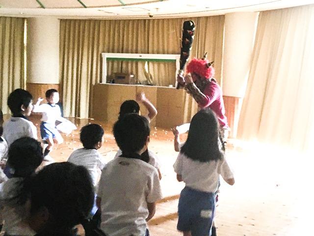 園児たちの攻撃に、鬼は逃げ惑い、さらに、福の神さんに扮した先生が登場すると、鬼は退散しました。