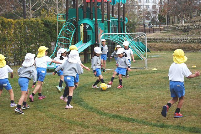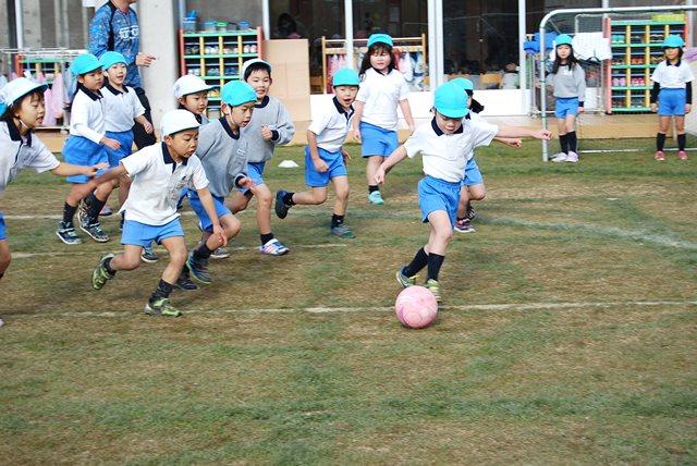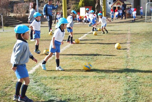 練習の最後にはミニゲームを行いました。子どもたちはみんな夢中になってボールを追いかけ、攻める⇔守るに臨機応変に対応します。最低気温が0℃を下回るとても寒い日でしたが、子どもたちはボールを追いかけて元気いっぱい園庭を駆け回りました。