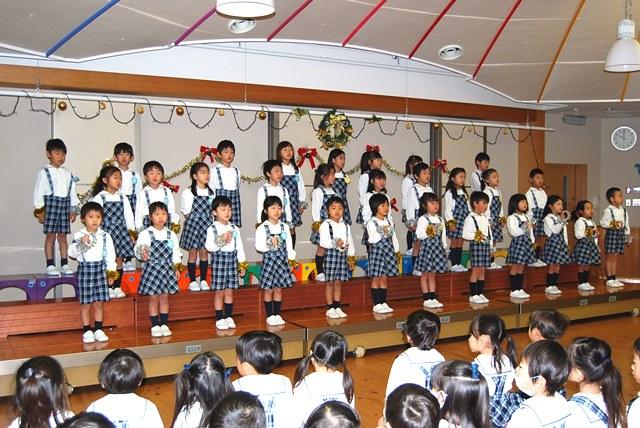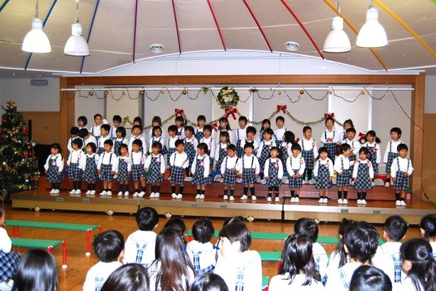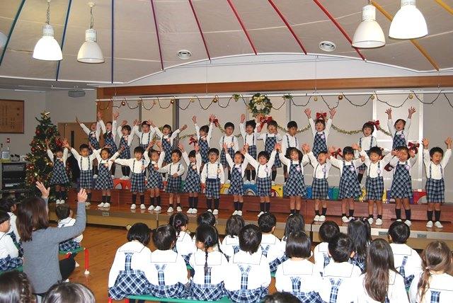 サンタさんに届くように、まず年少さんが「クリスマスの歌が聞こえてくるよ」の歌を披露しました。年中さんは「ヤッター!サンタがやってくる」を合唱し、「ヤッター!」と元気いっぱいのパフォーマンス。年長さんは「うさぎ野原のクリスマス」を木琴や鈴などの楽器を交えて合唱しました。