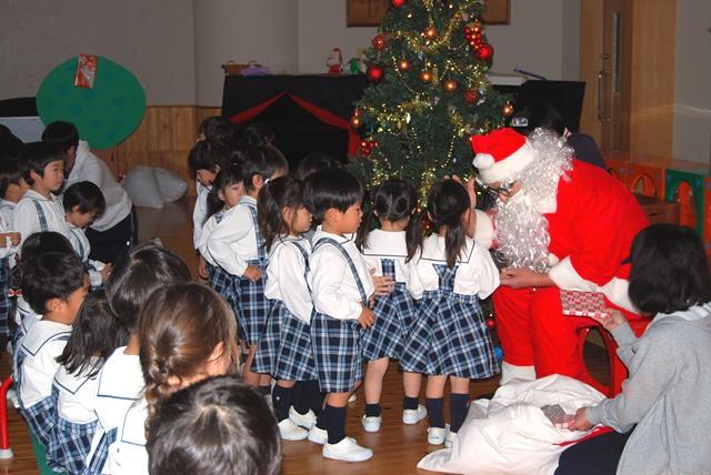 入口の方を見ると、なんとそこには大きな袋を抱えたサンタさんの姿が…。みんな歓声をあげて大喜び。英語で質問を試みるなど、サンタさんを囲んで楽しいひとときを過ごしました。