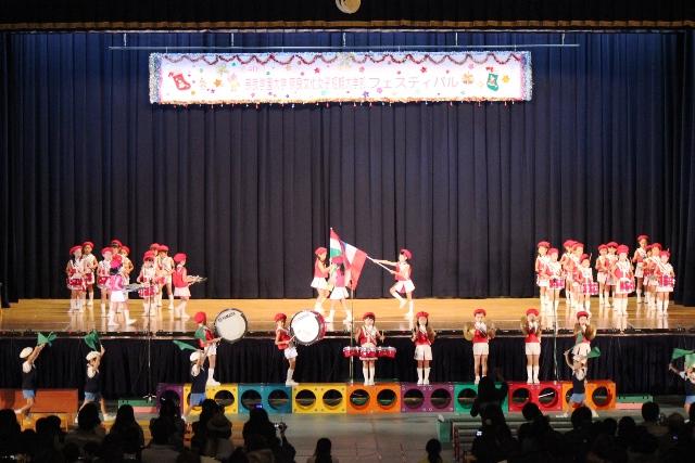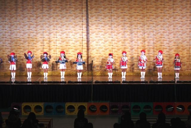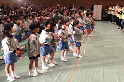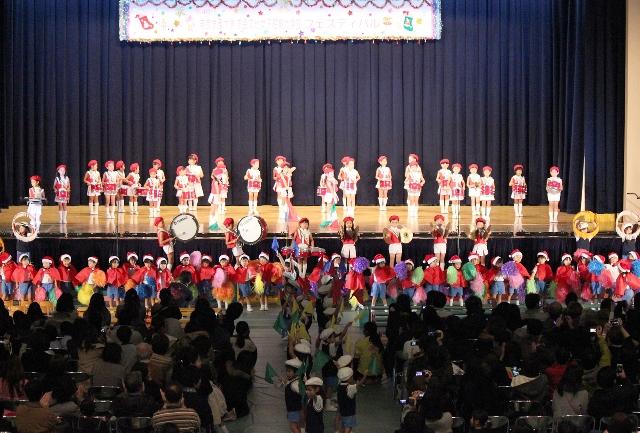 フィナーレでは年長組のマーチング演奏に合わせて、年中組と年少組はダンス。MY体育館の大きなステージでも動じることなく、一つひとつの動作をきっちりと決めて、会場を楽しい雰囲気に包み込みました。全員の息がぴたりと決まってパフォーマンスを終えると、会場から大きな拍手をいただきました。
