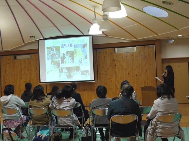 続いて益田主任より、入会要項や保育内容などを説明。スライドを使って、「うれしい」「たのしい」「おもしろい」を体験する、いちご組の一年の活動を紹介しました。