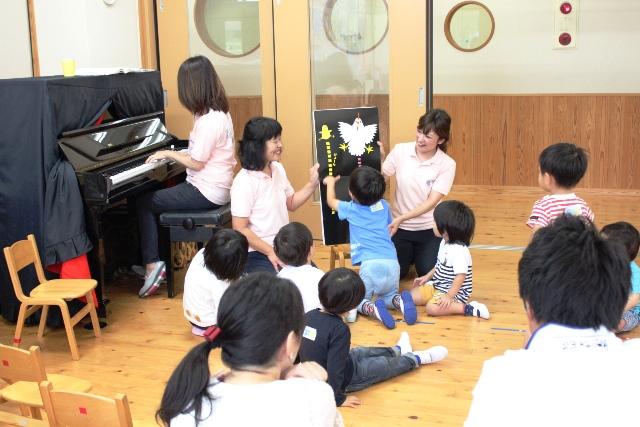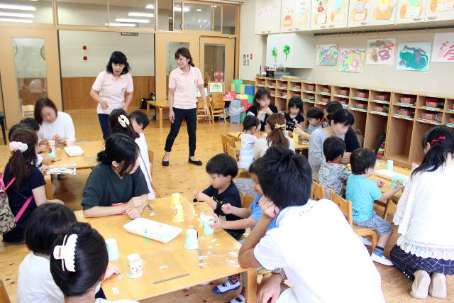 続いて、保育室に戻ると、大型絵本の読み聞かせと親子での工作遊びやが始まりました。工作は、紙コップと輪ゴムを使って、”ぴょーん”と紙コップが飛び出すおもちゃ作りでした。紙コップに好きな色紙や動物の顔のイラストを貼り、もう一個の紙コップの切れ目に輪ゴムをひっかけると完成しました。そして、紙コップを重ねて手を放すと、紙コップが勢いよく上に跳ね上がる様子に、子どもたちはびっくり。次第に楽しそうに何回も繰り返していました。