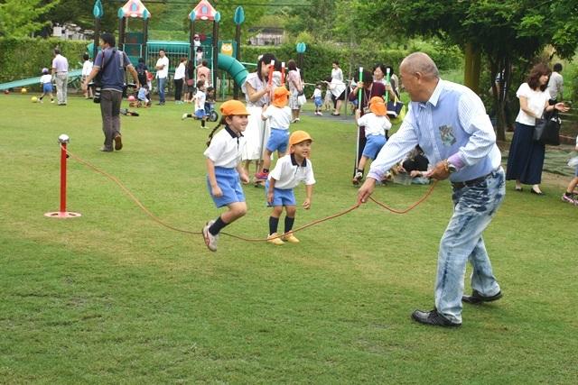 また園庭では、「竹馬」「フープ」「大縄跳び」「サッカーゲーム」などが行われました。おじいちゃんと一緒に竹馬を競ったり、大縄跳びで何度も引っかかる園児たちを、微笑みながら縄を回すおばあちゃん、とても盛り上がっていました。