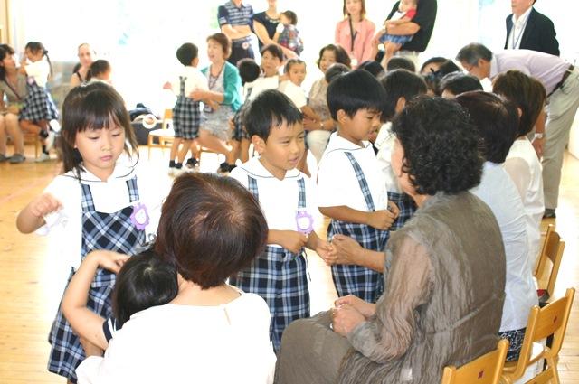 その後、園児たちと祖父母の皆様は、それぞれの保育室に入り、保育参観を行いました。リズム遊びなど日ごろの活動を参観していただきました。最後に園児たちは、この日のために用意した手作りのプレゼントを「おじいちゃん、おばあちゃん、いつもありがとう」と祖父母の皆様に手渡し、敬老の日の参観は終了しました。