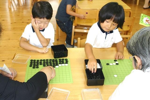 園児たちは、保育室で「あやとり」「かるた」「こま」「折り紙」「おはじき」「囲碁」「紙鉄砲」「お手玉」「めんこ」「けん玉」など、昔ながらの遊びを祖父母の皆様と楽しみました。