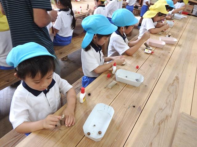昼食後は木や葉っぱ、木の実など自然の物を使って人形や置物などを工作しました。その出来ばえに久保館長も感心されていました。
