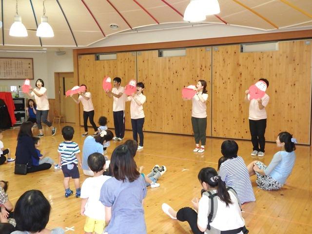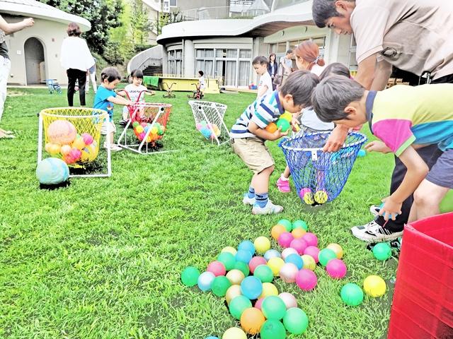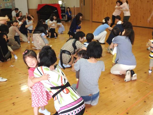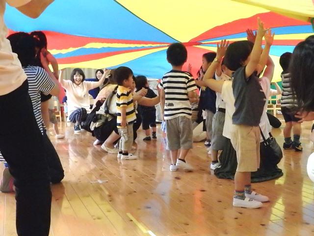 思い切り遊んだ後は、お片づけをして全員が遊戯室へ移動。遊戯室では、最初に「むすんでひらいて」をみんなで歌いました。続いて「動物体操」を行い、ウサギ・ゾウ・ゴリラになって元気よく動きました。次に、先生が大きなバルーン持って、子どもたちがなかに入っていくと、みんなおおはしゃぎ。最初から最後まで笑顔で楽しんでいました。