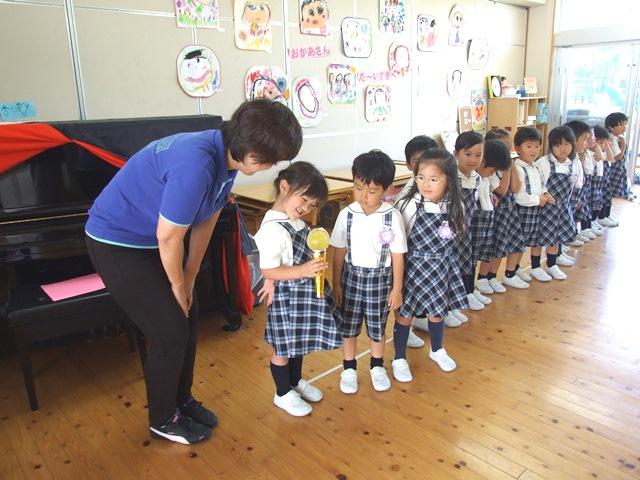 年長組は、「いつもごはんを作ってくれてありがとう」、「優しくしてくれてありがとう」と、一人ずつ『ありがとう』の気持ちを伝えた後、お母さんたちに手作りのメッセージカードとキーホルダーを手渡しました。普段は思っていても、なかなか言えない『ありがとう』の気持ちを伝えることができた子どもたちはもちろん、その気持ちを受けとめた保護者の方も、とても幸せそうな笑顔でした。