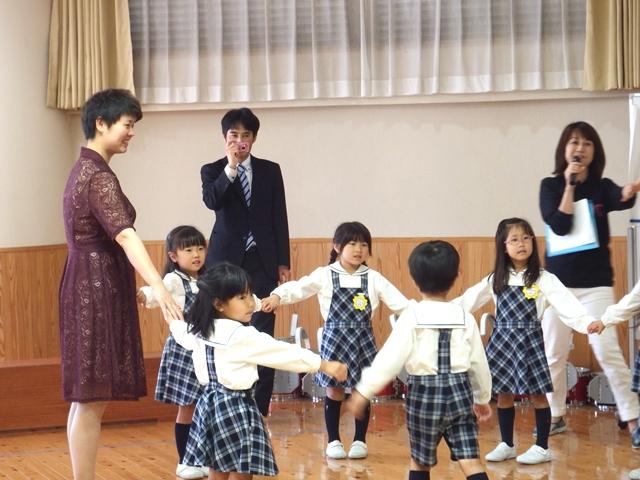 続いて、年長児によるウエルカムセレモニーがありました。園児たちは練習した中国語で挨拶をし、漢詩「春暁」を素読したあと、「幸せなら手をたたこう」を日本語と中国語で元気に歌いました。そのあと、中国からのお客さまも一緒に手をつないで輪になり「ドンパチダンス」を楽しみました。