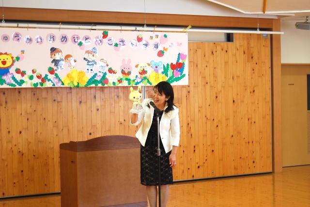 次に西田明恵園長が、うさぎのミミちゃんと一緒に歓迎のごあいさつ。「遊びの中でいろんなことを学び、心豊かに成長する子どもたち。また2歳児保育の経験が、幼稚園入園もスムーズに促します。夢の種を大きく咲かせるため、温かく見守ってまいります」と語りました。