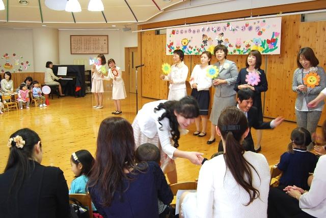 教職員の紹介に引き続き、みんなで「お花が笑った」の歌を合唱。次に「先生とお友だち」の歌を歌いながら、先生たちがいちご組1人ひとりのお友だちと握手をして回りました。