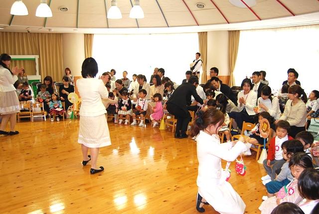 最初にみんなで「むすんでひらいて」を歌い、和やかなムードで式がスタート。次に1人ひとりの名前が呼ばれ、入会が許可されます。先生が名前を呼ぶと、みんな「はい」と元気にお返事ができました。今度は先生がいちごのペンダントをかけてくれます。年長の子どもたちが、この日のために一生懸命作ったものです。ペンダントをかけてもらった子どもたちは、ちょっぴり誇らしげな表情でした。