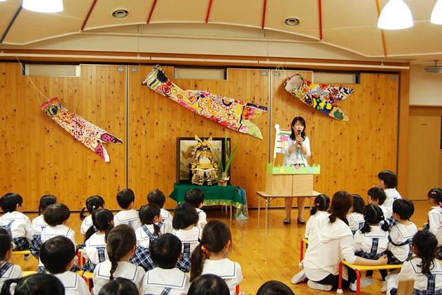 次に西田明恵園長が、こいのぼりのいわれや端午の節句の意味などについて紹介。紙人形を使って、子どもたちにわかりやすく伝統的な風習を伝えました。最後にこいの滝登りのお話にちなんで、ちょっとしたマジックも披露。滝を登ったこいが絵から消えると、子どもたちは目を丸くして、口々に驚きの声をあげていました。