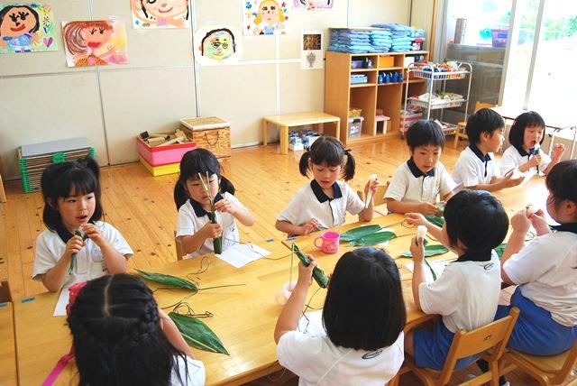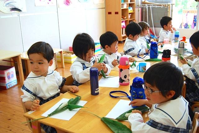保育室に戻ると、1人ひとりにちまきが配られました。緑の葉で包まれた見慣れない形や香りにみんな興味津々。くるくるとひもを解いて葉を開け、中にくるまれていたお団子をおいしくいただきました。