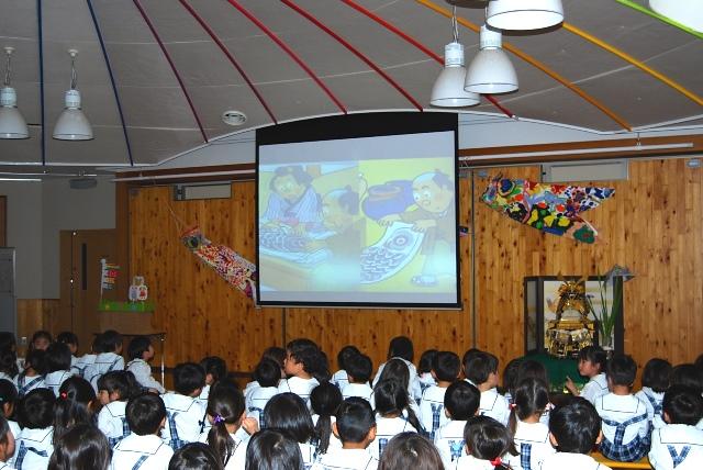 続いて元気よく「こいのぼり」の歌を歌ったあと、「こいのぼりさん、ありがとう」というお話の電子紙芝居を見ました。こいのぼりに込められた願い、子どもの日に食べる柏餅やちまきの由来を学びました。