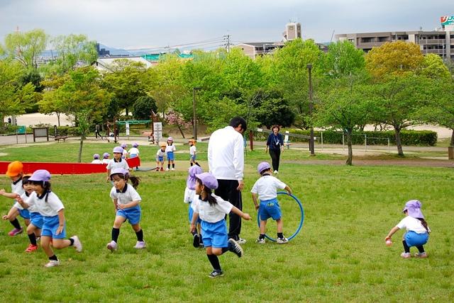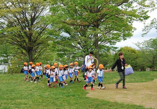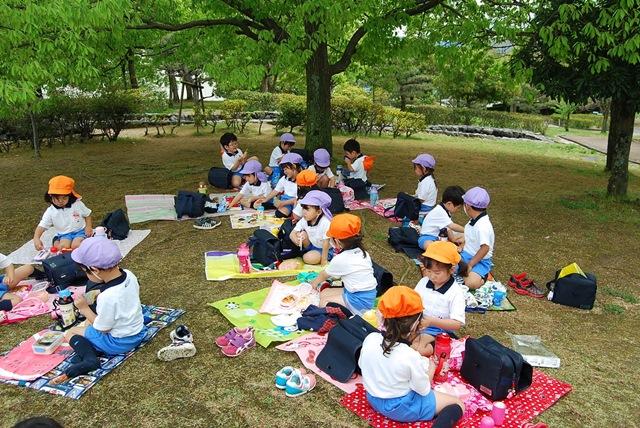 4月23日、年中の子どもたちが、大和郡山市にある「九条公園」へ遠足に出かけました。前日からの雨も上がり、時折初夏のような陽射しが注ぐ爽やかな気候の下、子どもたちは元気いっぱい遊びました。