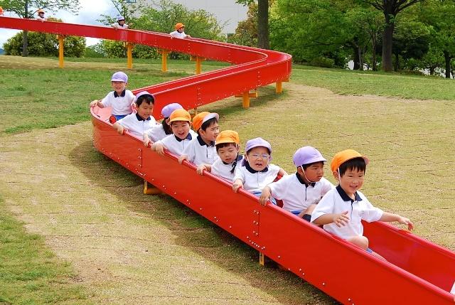 公園に到着して記念撮影を終えると、子どもたちはローラー滑り台へと駆け出します。お尻の下でころころとローラーが転がる長い滑り台に、みんなワクワク。お友だちと一緒に滑り下りては、また楽しそうに駆け上がっていきました。その後芝生の広場でフープやボールを使って遊んだり、アスレチックなどの遊具にもチャレンジ。野原のお花を摘んでお店ごっこを始める子もいました。またこの日、公園でユーフォニアムという楽器を練習していた人が、子どもたちのために即興で「ぞうさん」の曲を披露。優雅な生の音色に触れ合うという、思いがけないエピソードもありました。