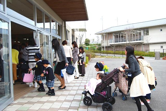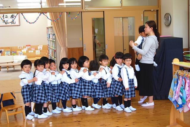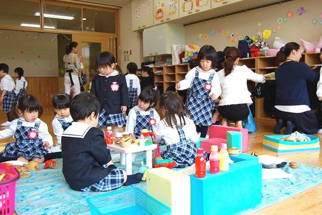 年少のもみじ組とさくら組の子どもたちが、真新しい制服を着て、保護者の方と一緒に初登園。先生が一人ひとりの名前を呼びかけて、「おはよう」とあいさつをして迎え入れました。保育室に入ると、持ち物を決められた場所に仕舞ってから、おままごとや電車遊び、ブロックなど、それぞれが好きな遊びを始めます。中にはお母さんから離れて、泣き出す子どももいますが、先生がしばらく抱っこをしたり手を握って安心させると、そのうちお友だちの輪に入っていきました。