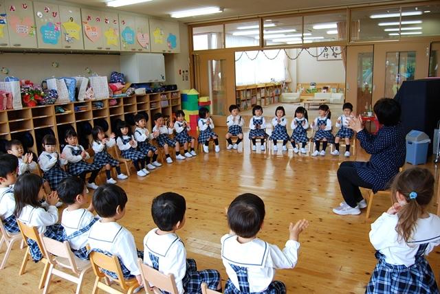 おかたづけの後は、トイレ電車でお手洗いへ出発。順番にトイレを済ませて戻ってくると、今度は椅子に座って手遊びの時間です。先生に続いて、楽しそうに歌を歌ったり、手を動かしたりしていました。先生は、上手に手遊びができた時も、お友だちと仲良く遊んでいる時も、ちゃんと順番を待っている時も、たくさんほめてくれます。子どもたちはその度に少しうれしそうな表情を見せていました。