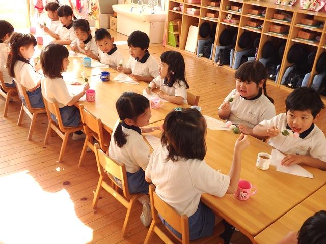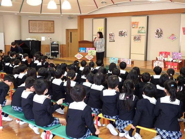 まず、ひな祭りについて、先生から「女の子が病気をしたり事故にあったりしないよう、すくすくと元気で大きくなるようにおひな様にお願いする日です」とお話がありました。園児たちは、わくわくした表情をして話を聞いていました。