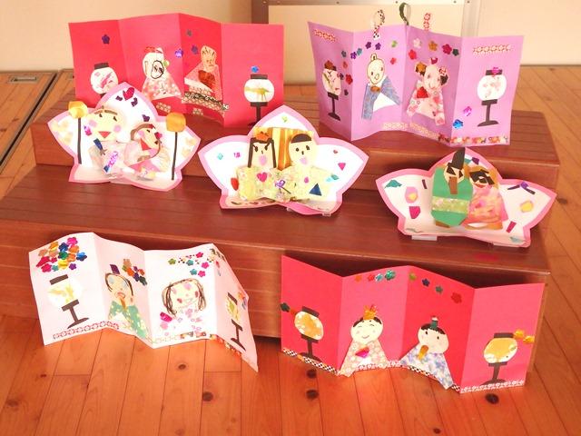 遊戯室のステージの上に、園児が作ったカラフルな紙のお雛様が飾られている中、ひな祭りの会が行われました。