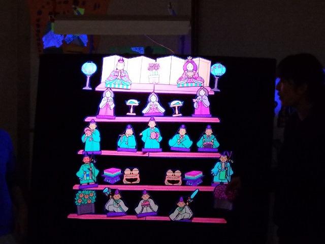 園児たちが「うれしいひなまつり」の歌を元気に歌い、その歌詞に合わせて、ステージ上に設置したブラックライトで光るパネルシアターのひな壇に、男雛と女雛、三人官女、五人囃子を配置していきました。