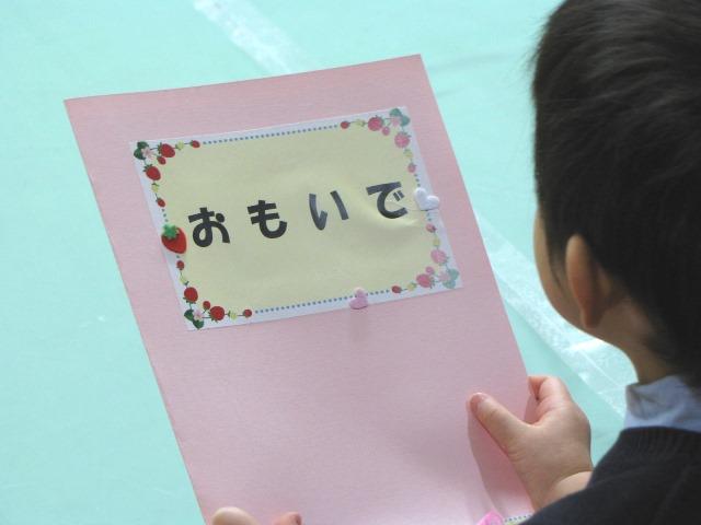 保護者の方とともに登園してきたいちご組の子どもたちは、いつも通り元気いっぱい。開会のことばのあと、終了書の授与が行われました。ひとりずつ名前が呼ばれると「はい!」と大きな声で返事。園長先生から「終了書」が手渡されると、子どもたちは開いてみたり、お母さんに見せたりとうれしそうな様子でした。