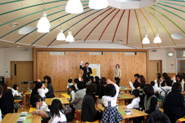 子どもたちは学年ごとに集まり、関西棋院の常務理事の藤原克也棋士6段をはじめ、年長組の課外講座「囲碁」の教室でご指導いただいている石井茜棋士2段から、分かりやすくルールを教えていただきました。