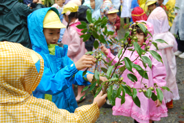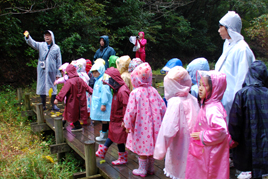 前回もお世話になった久保館長に、森の中で見られる植物や動物のお話をしていただき、探検に出発しました。朝からの雨にも負けず、レインコートを着て森を観察しながら元気に歩きました。夏にホタルを見に来た水辺自然園を歩き、道中で見つけた珍しい花やキノコの説明をしていただきました。そして久保館長にアラカシ(ドングリ)の枝を採っていただき、皆で分けあいました。他にも綺麗な落ち葉やシイの実を拾い、おみやげにしました。