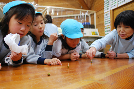 森の工作館に戻り、おにぎりをいただいた後は楽しみにしていたドングリの試食です。マテバシイの実は炒って、シイの実は電子レンジで温めていただきました。初めて食べるドングリの感想は「おいしい!クリみたい」「モチモチしてる」と、驚きの発見でした。そしてドングリでコマとヤジロベエ、笛を作って遊びました。