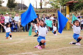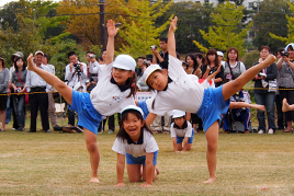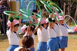 年少組はかけっこやサーキットではゴールめがけて全力で走りぬき、リズムや組体操ではこの日のために練習してきた成果を披露しました。年中組は忍者になりきり、剣を投げたり、とび箱に挑戦したりしました。年少組はフープを使って全身でお日さまを表現し、年長組の組体操では、技が決まる度に会場から大きな拍手が送られました。