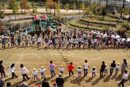 途中、サプライズとして保護者や先生、卒園児たちによる玉入れが行われ、大いに盛り上がりました。年長組の4色対抗リレーでは、年少・年中組のお友だちも一生懸命応援し、白熱のレースとなりました。最後に親子全員で「人間っていいな」の曲に合わせてダンスをして、お父さんお母さんに高くだっこをしてもらい、園児たちは楽しそうに笑顔を見せていました。