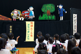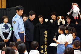 そして、奈良西警察署の稲本厚交通課長から、「歩道を走らないこと、止まっている車の周りで遊ばないこと」とお話があり、続いて女性部の皆さんによる人形劇『チビの冒険』が上演されました。園児たちは、犬のチビや子どもたちが、交差点や道路に潜む危険を婦警さんと一緒に体験する内容から交通安全のルールを学びました。
