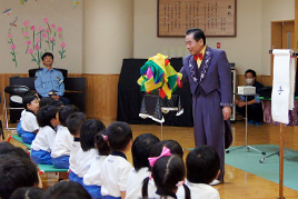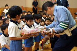 劇の終了後に、園児たちが「いろんなことを教えてくれてありがとうございました。」と、お礼の言葉とカードを贈ると、女性部の皆さんからは、手作りの交通安全人形『ピコちゃん』を、お巡りさんからも『白バイ消しゴム』などをプレゼントしていただきました。