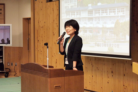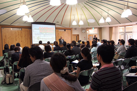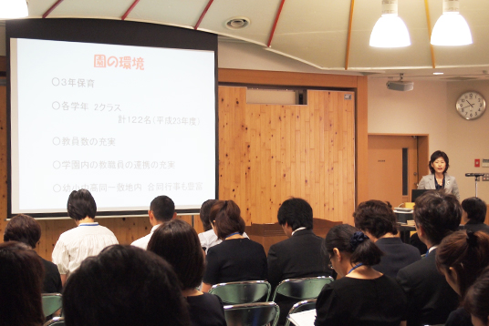 続いて、荒井恵子園長が12年一貫教育システムの土台となる幼稚園教育の重要性とその趣旨を伝え、島野恭子教頭がパワーポイントを使って園児たちの日々の活動の様子を紹介した後、今後の出願や入試の内容について説明しました。