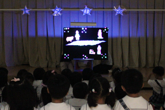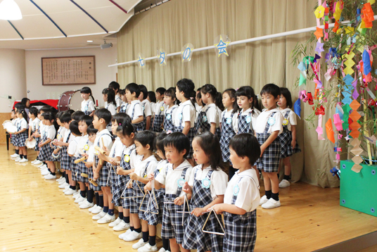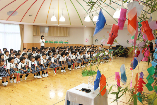 園の遊戯室で7月7日、七夕の会を行いました。荒井園長が”七夕”について話した後、サトイモの大きな葉とその上に落ちた雫(しずく)、そして、用意した硯(すずり)と墨と筆及び半紙を見せながら、「空の上の天の川から落ちてきた雫ですよ。七夕の日に筆でお習字をすると、字が上達すると言われています」と園児たちに語りかけました。 |