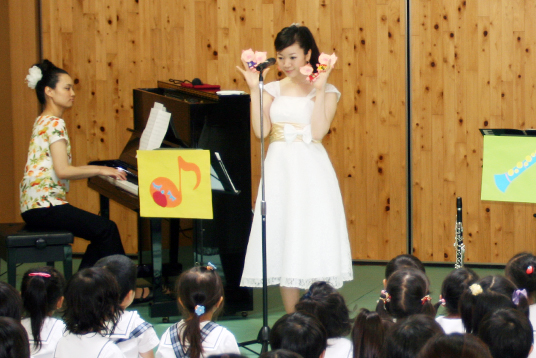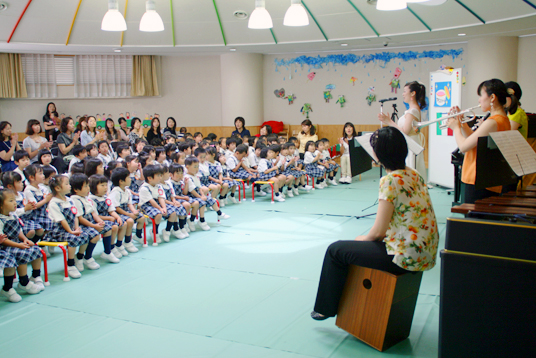 6月22日、園の遊戯室で、Rin(りん)による音楽会「夢いっぱいコンサート」が開かれました。Rinは、年長組のリズムクラブの課外講座で指導していただいている遠藤先生をはじめとする女性5人のアンサンブルグループです。当日は保護者の方にも参加いただき園児と一緒に、クラリネットやトランペット、ピアノ、マリンバ、そして、美しい歌声のハーモニーを楽しみました。 |