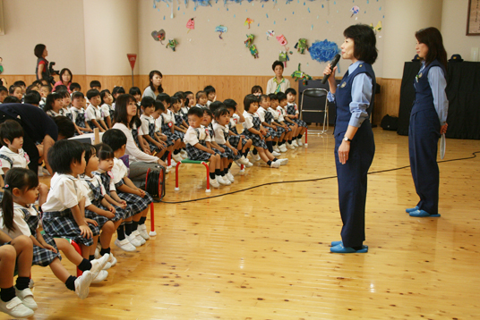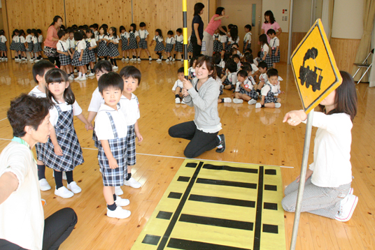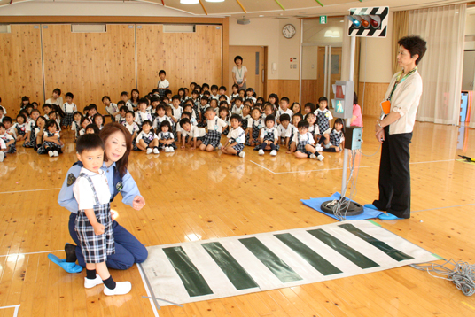 遊戯室に集まった園児たちは、信号機や踏切の横断方法、車の運転手から見えない死角の話などを聞き、西警察署員から「信号機の青色は渡ってもいいという意味です。青だからといって安心してはいけません。車が止まってくれるのかどうか自分の目で確認して渡りましょう。自分自身で事故に合わないよう気をつけましょう。」と教えてもらいました。